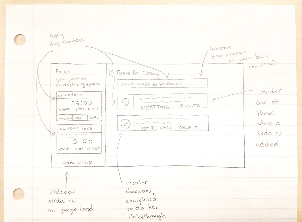 To develop the application, I used React to split Focus into several components. The component holding the entire app is 'Client', which then renders 'Sidebar' and 'Todo'. In turn, Todo renders 'TodoEntry' as the user adds entries to the list.