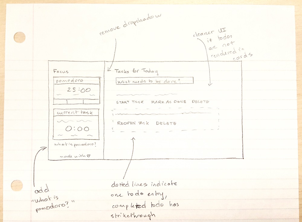 Using the insights gathered in the user study, I brainstormed design solutions to seamlessly integrate time management techniques with a todo application. I drafted designs with pencil and paper to iterate upon ideas, incorporating a pomodoro timer along with a stopwatch to track the total time spent on a specific task. Each entry of the todo list needed to support actions to mark as done, reopen, start, edit, and delete.